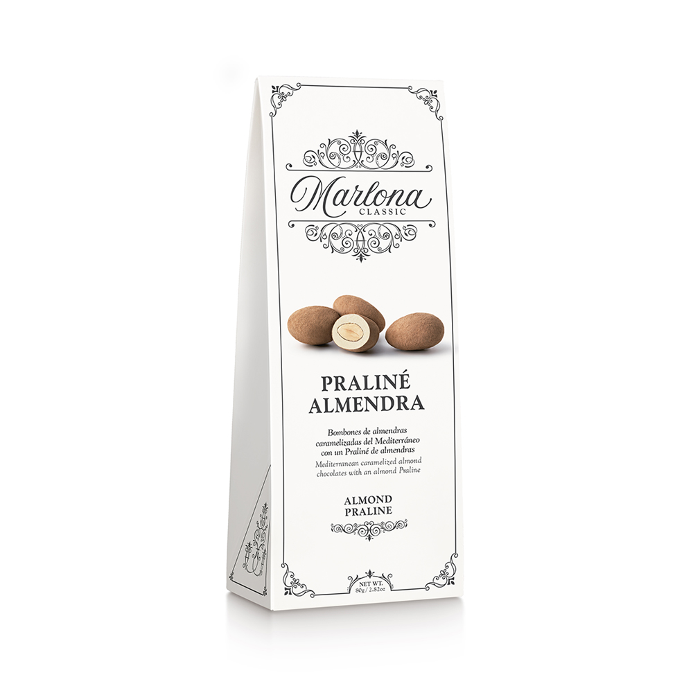 Marlona es nuestro bombón más emblemático: almendra caramelizada en el interior, chocolate por fuera y una fina capa de praliné que redondea cada bocado. Una combinación equilibrada entre textura crujiente y cremosidad, pensada para disfrutar con calma.