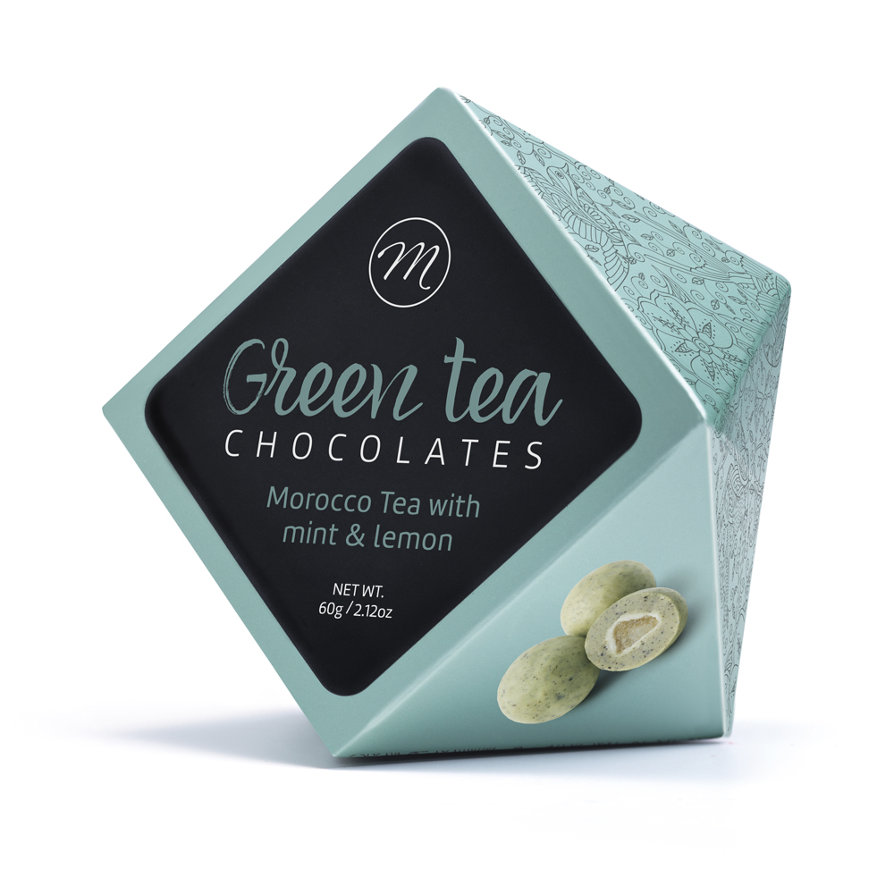 Chocolate blanco (azúcar, manteca de cacao, leche desnatada en polvo, materia grasa láctea, emulgente (lecitina de soja), aroma natural de vainilla, aroma), lactosuero, almendra, limón confitado (7%) (piel de limón (25%), glucosa, fructosa, azúcar, acidulante (ácido cítrico), conservador (sorbato potásico, metabisulfito sódico)) té verde Morocco (2%), manteca de cacao, menta en polvo (0,1%), emulgente (lecitina de soja), aroma.